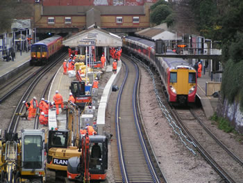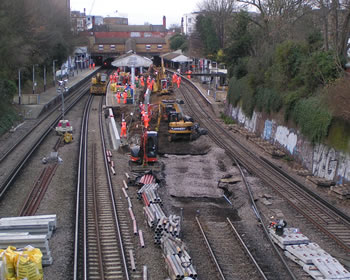 For many weeks now, contractors working for Network Rail have been busy lengthening the platforms at stations between Waterloo and Windsor. The contract was due to be concluded by 31 December 2011. Strangely, virtually nothing seemed to be happening at Putney itself. But everything changed when train services ceased on Christmas Eve. A small army then moved in to make the station ready for trains of ten coaches, rather than the current maximum of eight coaches. Working 24 hours a day, it looked as if the job would be completed in time for normal services to resume on the morning of 3 January. With no services on Christmas Day nor Boxing Day, initially work was focused on the island platform in the middle of the station: platforms two and three. This is the view from the Oxford Road bridge at lunchtime on Boxing Day. A permanent way train can be seen parked under the bridge at the end of platform four. |