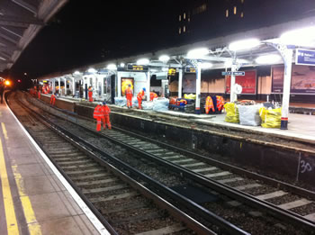 Taken from a slightly different angle, the track has been completely removed from platform two, in readiness to be skewed further away from platform one, prior to that platform being rebuilt a few days later. Platforms two and three are in the process of being lengthened in the direction of Waterloo. |