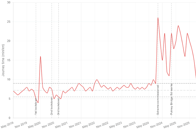 The picture on Putney High Street northbound in the evening peak told a different, but equally concerning story. Journey times there were already rising from 2022 onwards — well before any works began. The scheme then pushed times to around 17 minutes per kilometre by mid-2025: not quite the catastrophic peak seen on the morning corridor on Lower Richmond Road, but a serious degradation in a direction that affects thousands of commuters returning from central London each evening.