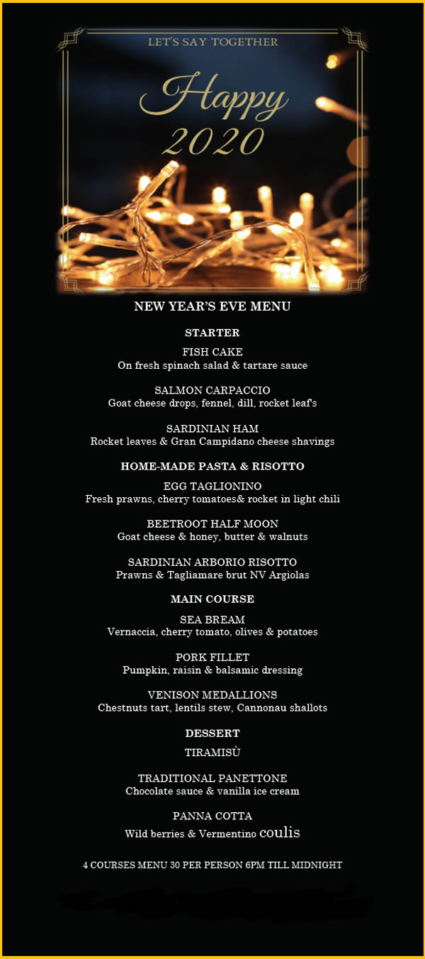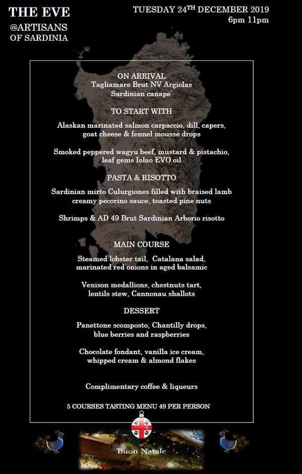 A festive menu and invitation to Christmas Eve or New Year's Eve at Artisans of Sardinia